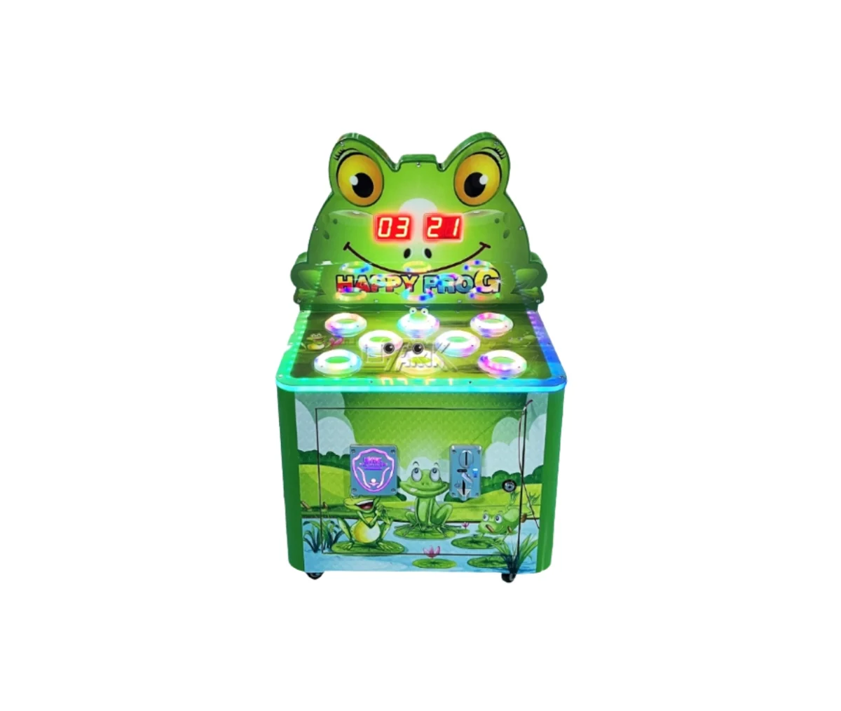 Hit Frog 1 Player este un joc arcade interactiv de tip whack-a-mole, special conceput pentru copii, unde jucătorii trebuie să lovească cu ciocanul broscuțele care ies aleatoriu din găuri. Designul colorat și luminile LED creează o experiență distractivă și energică, ideală pentru spații de joacă indoor și centre family entertainment.